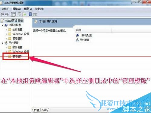 2、弹出“本地组策略编辑器”窗口,在窗口左侧树目录里,找到“用户配置”下的“管理模版”选项,选择此项。