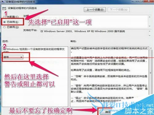 提示:经过驱动签名设置后,如果未能出现阻止窗口,可以重新设置一下驱动程序签名,先设置为“未配置”,按“应用”与“确定”,退出组策略,然后再进组策略,重新设置为“已启用”和“警告”,再按“应用”与“确定”,为什么要这样麻烦呢,其实这就是激活一下,让系统重新记住你的新设置,这是解决无法弹出阻止窗口的好方法。