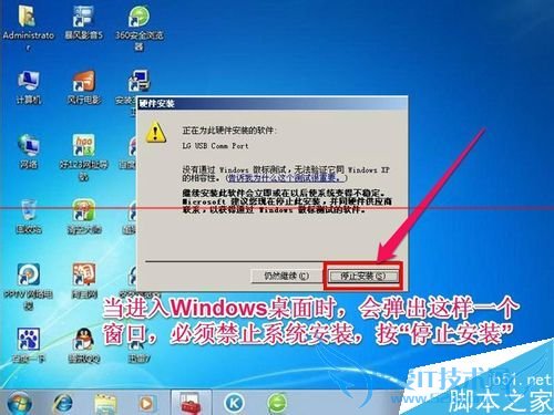 6、重新启动电脑,正常进入Windows7系统,这时,就会弹出一个警告提示框,询问是否阻止没有签名的驱动程序安装,这就是最关健的地方,当然要阻止,只有阻止了系统自动为电脑安装显卡驱动程序,我们才有机会更新我们想要的驱动,只有这样,显卡的驱动程序才能更新成功,所以按“停止安装”按钮。