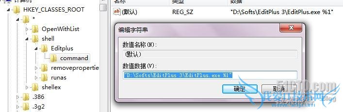 2、在 shell 下新建项 "editplus";修改右侧默认值为用EDITPLUS打开,