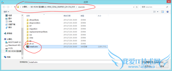 3.单击“点此选择win8镜像中install.wim”,弹出窗口。请选择虚拟光驱中sources目录下的install.wim,然后点“打开”
