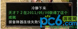 还有个失败掉级的“强化失败(概况失败)并掉落等级”,有时候运气不好会连续出现5次失败系统会给你一个隐藏的成就给你,这个时候你就要真的冷静下来了不要在强化装备了,或者说是换件装备可以继续强化也可以把强化的界面关掉在点开强化装备,这样就不会连续的出现失败的几率了。