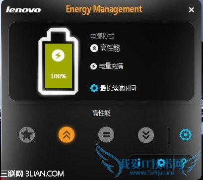 步骤6:在您笔记本重新懂完成后,请您使用鼠标左击“开始”按钮,在弹出的菜单中使用鼠标左击“所有程序”项目,再使用鼠标左击“Lenovo”项目,在弹出的菜单中使用鼠标左击“Energy Management”项目,之后再使用鼠标左击“电源管理选项”开启联想电源管理软件主界面。电源管理主界面开启后请您将电源管理模式设置为“高性能”,如下图: