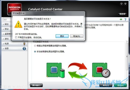 步骤5:在弹出的窗口中请您使用鼠标左击“更改”按钮,点击后屏幕会因为显示卡的切换过程而出现多次闪烁,您无需进行操作,只需耐心等待即可。闪烁完成后,您直接将显示卡属性窗口关闭,并重新启动计算机即可。如下图: