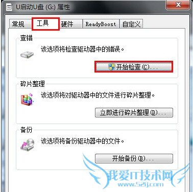 ②、在弹出的u盘属性窗口中,选择“工具”标签,再点击“开始检查”按钮,如下图所示:
