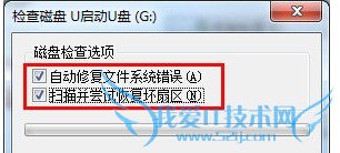 ③、接着勾选“自动修复文件系统错误”和“扫描并尝试恢复坏扇区”,并点击“开始”按钮,如下图所示: