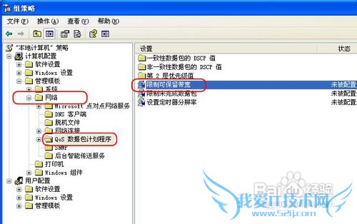 在(管理模板)下面点开(网络),依次点击(QoS数据包计划程序),再点击右边框的(限制可保留宽带)。