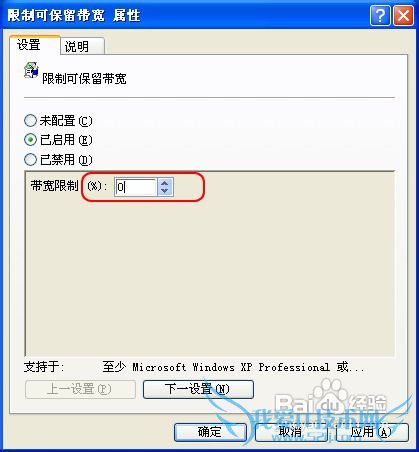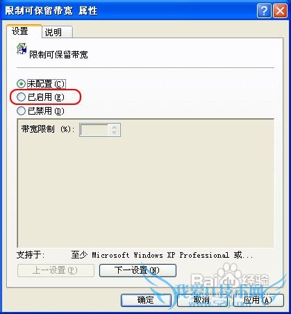弹出限制可保留宽带属性,选择(已启用)。选完会出现下面宽带限制设置项,将20改为0,最后按确定键,系统提速设置完成,上网速度会明显加快。