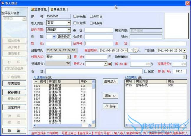 5) 入住登记简便化:无需手工填写资料,可将客人资料直接输入电脑,自动打印出入住登记表或预付金收款单,简化入住登记手续,缩短客人等待时间。