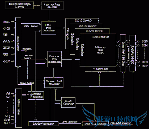 图中可以看出,DQ数据输入/输出线只有8根而不是32根,可以发现4个BANK是分时工作的,任一时刻只可能有一个BANK的数据被存取,0-3是它们的编号。每个逻辑BANK有8M个单元格(CELL),一些厂商(比如现代/三星)就把每个逻辑BANK的单元格数称为数据深度(Data Depth),每个单元由8bit组成,那么一个逻辑BANK的总容量就是64Mbit(8M×8bit),4个逻辑BANK就是256Mbit,因此这颗芯片的总容量就是256Mbit(32MB)。