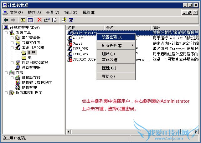 第四步:点击左侧列表中的用户,在右侧列表的Adminstrator上点右键,选设置密码