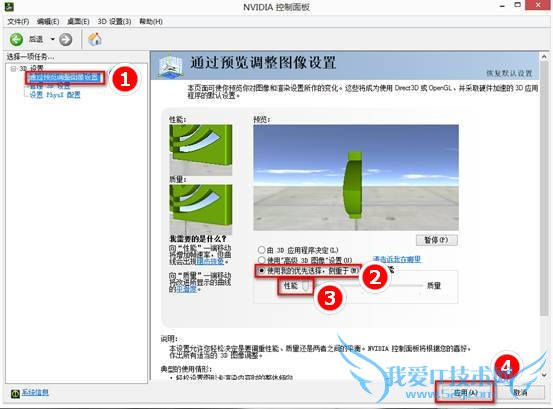 2.“3D设置”---“通过预览调整图像设置”---“使用我的优先选择,侧重于”---“性能”---“应用”;