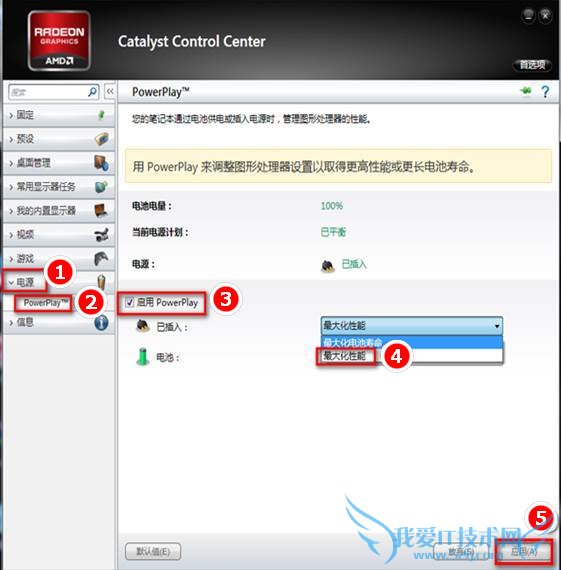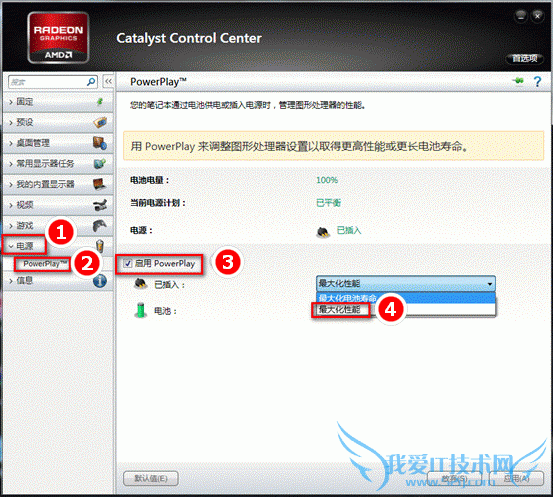 3. 点击“电源”---“PowerPlay”---“启用PowerPlay”---“最大化性能”;