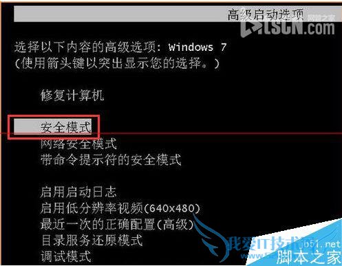 4、选择后发现和之前一样的情况,无法进入系统,一样是先蓝屏然后变黑屏。接下来我们重新启动,还是开机按F8,这次我们选择“安全模式”按回车进入。这一步是检查,用户是不是更新了驱动程度、安装了什么软件,系统文件受病毒破坏等。如果能启动则说明是上述所说的情况,此时需要在安全模式下删除软件等。