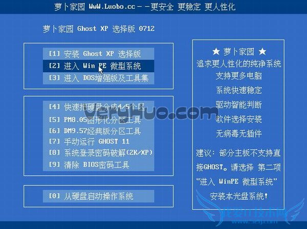 然后开始进行安装。现在的GhostXP光盘启动选项一般都加入WinPE微型系统,支持从WinPE安装ghost系统,intel965和p35主板用户推荐用该选项安装ghost系统,特别是sata串口光驱用户。