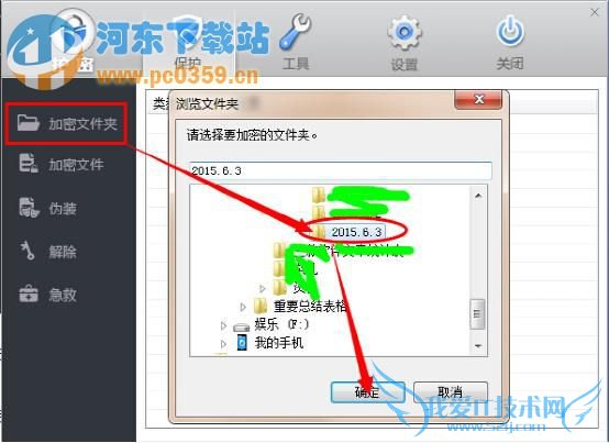 2、选择软件左侧的“加密文件夹”按钮,在打开的窗口中浏览并选中自己要加密的文件夹,然后点击“确定”。