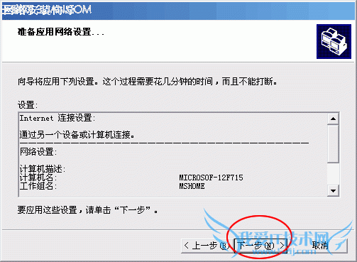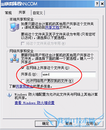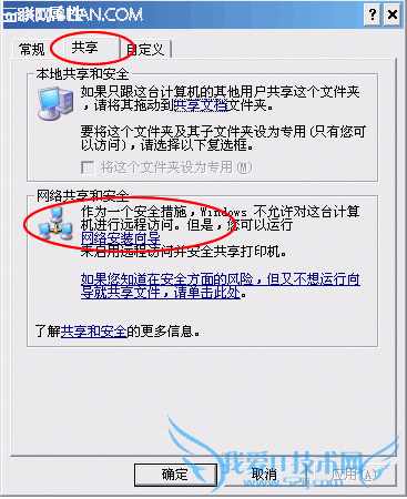 2、选择共享标签内网络共享和安全下的网络安装向导链接。(如本XP系统已设置过文件共享,直接跳到第7步)