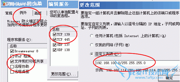选择文件和打印共享后点编辑,选择TCP 139后点更改范围,再选自定义列表,添加允许共享的计算机IP地址即可,图中允许整个192.168.100网段的计算机共享。