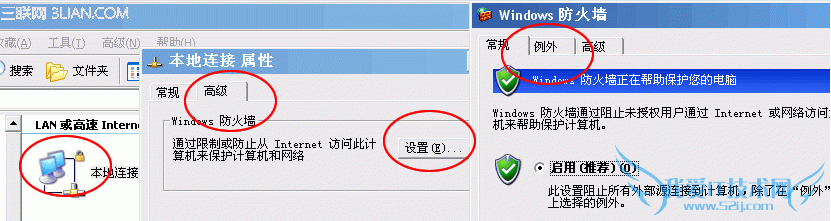 11、如在第9步中无法找到被共享对象,则要检查网络防火墙设置,使之允许来访者访问被共享计算机的139端口,或临时关闭防火墙。打开本地连接属性,选择高级后点设置,再点例外: