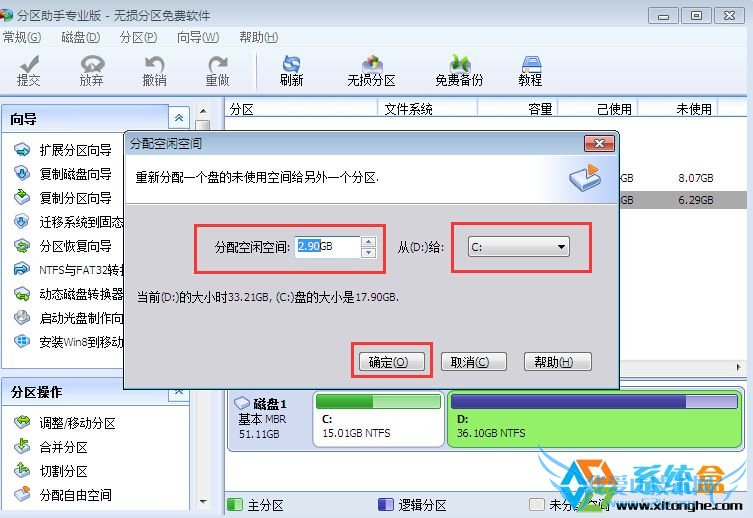 2、设定好你要分配给C盘的空间大小,并指定给C盘,然后点击确定;