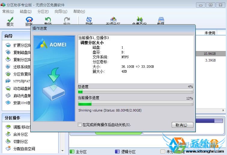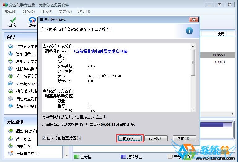 5、然后分区助手就自动帮助你分配空间了,我们需要的就是整一款咖啡,翘着二郎腿,哼几个小曲慢慢等待。