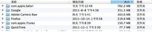 4、回到Caches文件件中,点击上面的“大小”就会按照占用空间的大小来排序了,回到Caches文件件中,点击上面的“大小”就会按照占用空间的大小来排序了