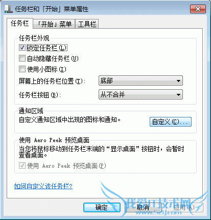 右键任务栏的空白处,选择属性。接着点击“通知区域”处的“自定义(C)”按钮。