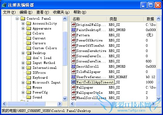 打开“HKEY_CURRENT_USERControl PanelDesktop”,在右边的窗口找到“WaitToKillAppTimeout”,将该键值修改为10000,单位是毫秒。