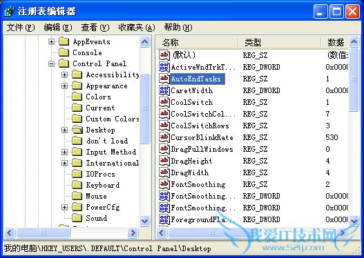 打开“HEKY_USERS.DEFAULTControl Paneldesktop”,在右边的窗口找到“AutoEndTasks”,将该键值修改为1。