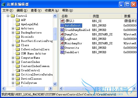 打开“HKEY_LOCAL_MACHINESYSTEMCurrentControlSetControlCrashControl”,在右边的窗口中找到“AutoReboot”,将该键值修改为1。