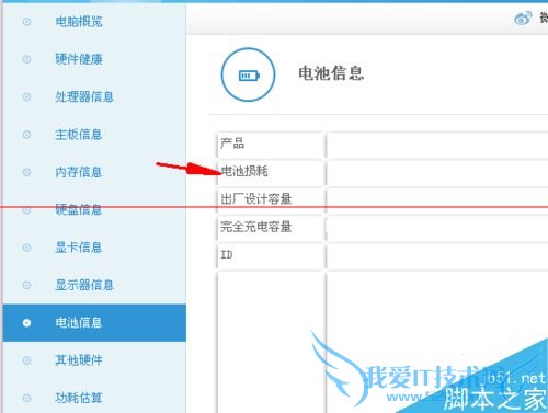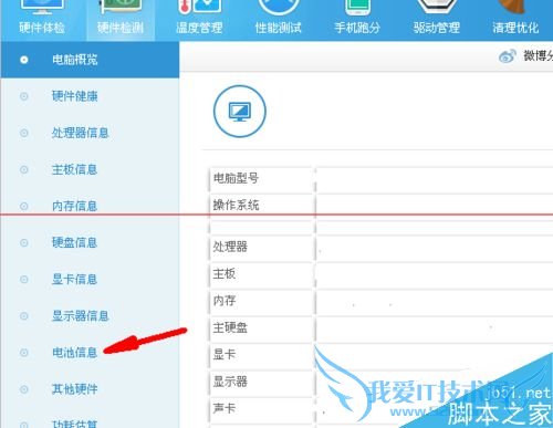 2、单击之后会进入到硬件检测面板,在面板的左侧有一个“电池信息”选项卡,单击该选项。