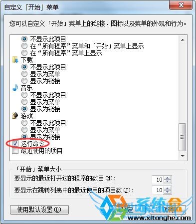 3、在“自定义开始菜单”中找到“运行命令”,(win7下载 www.xitonghe.com)并勾选该项,确定保存,当我们再次打开开始菜单就可以看到运行了。