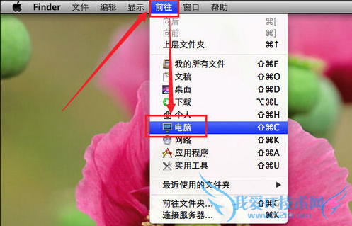 1、如果你需要处理的文件不在桌面上,那么需要先点击【前往】--->【电脑】