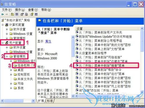 4,进入组策略窗口,按“用户配置”->“管理模板”->“任务栏和[开始]菜单”此路径,找到右侧的“从[开始]菜单中删除“搜索”菜单”这一项,双击。