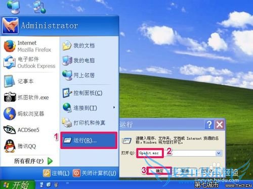 3,打开“运行”程序,然而在运行窗口中,输入gpedit.msc命令,按“确定”。