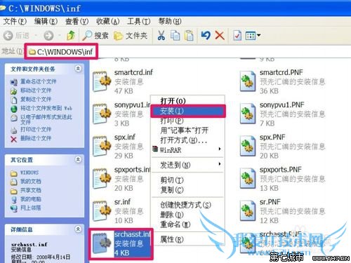 8,在这个文件夹界面,拖动右侧的滚动条,找到srchasst.inf这个文件,右键,选择“安装”,即可把“搜索”功能安装上。