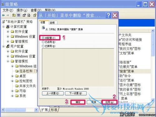 6,要想恢复开始菜单中的“搜索”,需要修改这里,把“已启用”改为“未配置”这一项,然后按“应用”,再按“确定”。搜索就能在开始菜单中显示了。