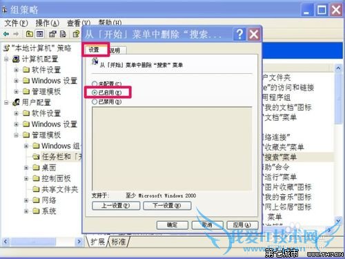 5,进入此项的属性窗口,在“设置”下面,显示的是“已启用”,怪不得不显示“搜索”菜单,原来被这里禁用了。