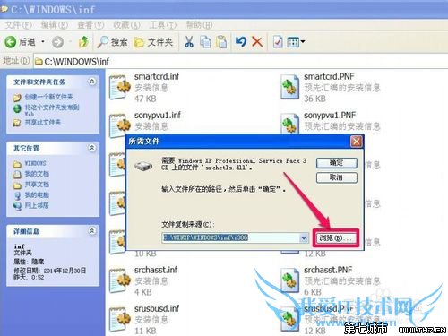 9,如果在安装时,提示缺少必要的文件,可按“浏览”按钮,按它给出的文件名,在C:/Windows/System32/文件夹下,找到该文件,把路径给它,就可以继续安装了,直接成功结束。