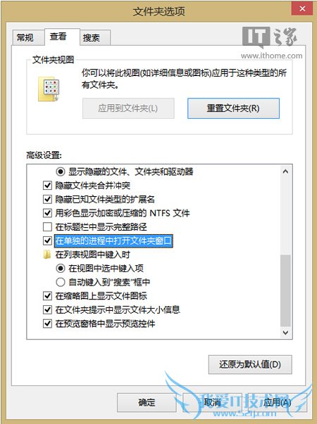 2、在文件夹选项中切换至“查看”选项卡,勾选“始终显示图标,从不显示缩略图”以及“在单独的进程中打开文件夹窗口”。保存并退出。