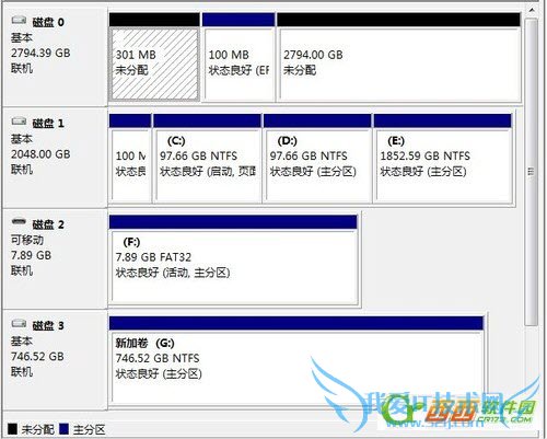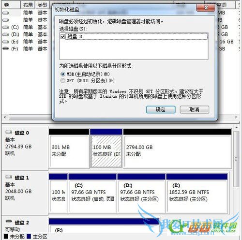 在磁盘管理其中,我们发现之前的3TB硬盘被分割成两块单独的硬盘,之后可以右键新建磁盘分区进行使用,不过分区格式依然为MBR。