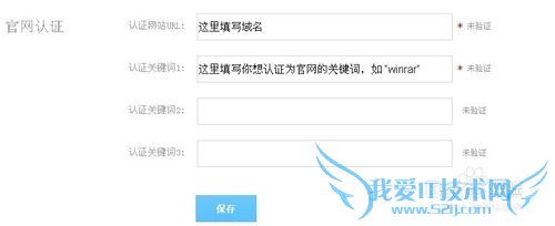 6.填写官网认证信息,认证网站url填写网站主域名即可,重要的是认证关键词的填写,要网站统计数据与实际情况相结合来定制。点击“保存”,提交审核,审核会在15个工作日内完成。