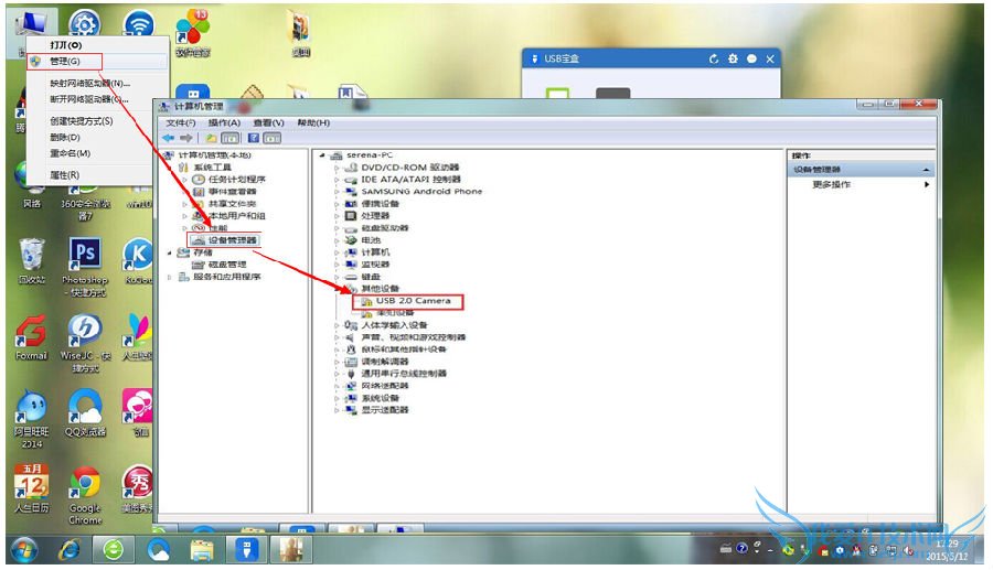 如果不知道自己的电脑摄像头驱动是否正常,可以通过设备管理器来查看。打开计算机——管理——设备管理器。在其他设备里面可以看到摄像头驱动显示了黄色感叹号,这说明摄像头驱动是异常的,需要修复。