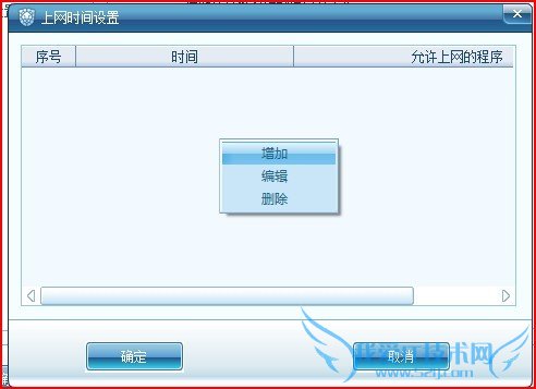 F、在上图空白区域点击右键出现右击菜单,点击『增加』菜单,弹出设置上网时间设置界面,在此界面中可以指定允许上网时间及允许上网的程序类型,根据自己的需要进行设置即可。设置后点击『确定』按钮即设置完成,设置时可以根据需要是否清空IE缓存。