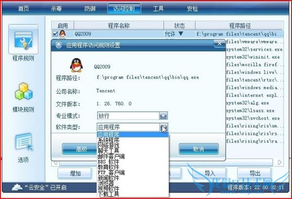 该设置中的“允许上网的程序分类”的确定需要在『应用程序访问控制』中手动设置,目前还不支持自动识别,默认都是“应用程序”,可以根据自己的需要更改该程序的程序类型,如图: