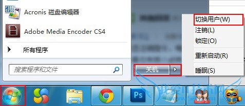 同样点击任务栏的开始,在打开开始窗口上“关机”后面有个小三角箭头,鼠标移动到这个箭头上,就会有“切换用户、注销、重新启动、睡眠”选项,选择“切换用户”即可。如图所示: