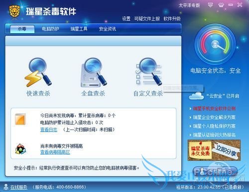 软件名称:瑞星杀毒软件2011太平洋免费专版(永久免费)