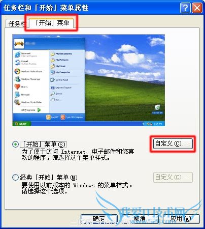 在“任务栏和「开始」菜单属性”窗口中,点击“「开始」菜单”选项卡,然后点击“自定义”按钮。如图 2 自定义所示: