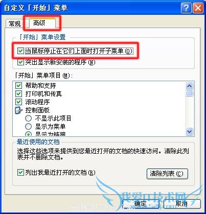 在“自定义「开始」菜单”窗口中,点击“高级”选项卡,然后选中“当鼠标停止在它们上面时打开子菜单”复选框,然后点击“确定”按钮。如图 3 自定义「开始」菜单所示: