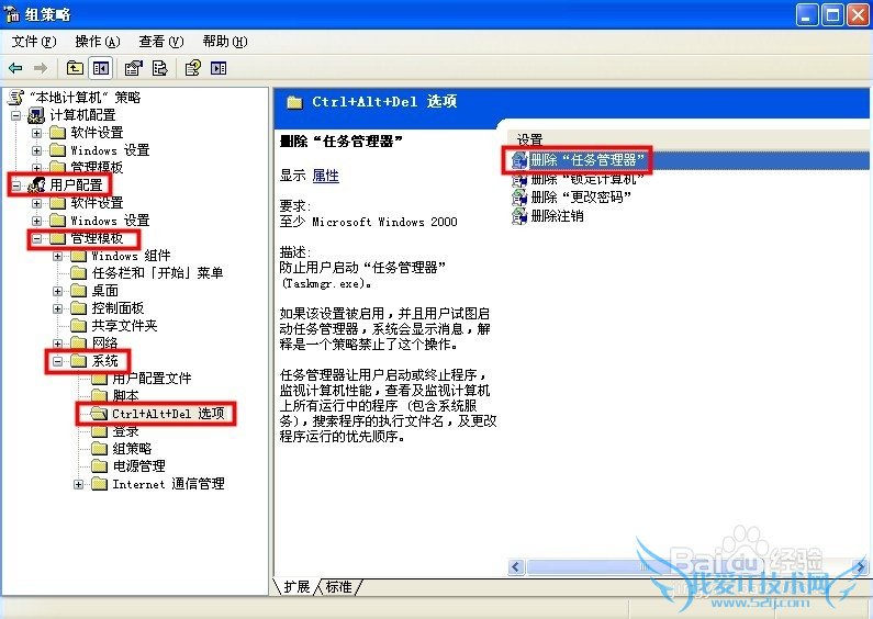 在“组策略”里找“用户配置”——“管理模板”——“系统”——“Ctrl+Alt+Del 选项”,在右侧找到“删除任务管理器”,然后鼠标双击。